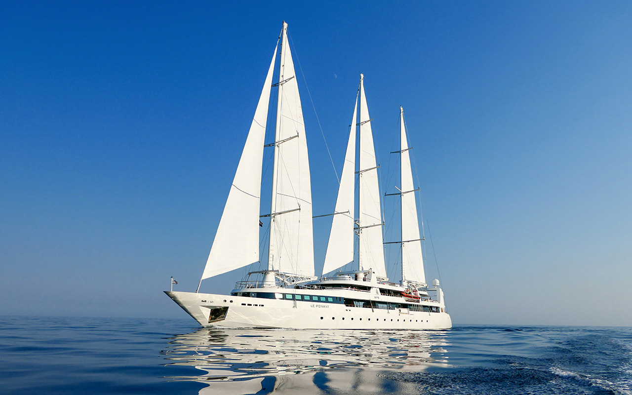 One of Compagnie du Ponant's sister ships at sea, a luxury cruise ship designed by the interior design studio jean-philippe nuel